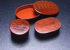 木曽桧を木理に沿ってへぎ、熱湯浸漬により曲げ加工を行い、そば道具や茶道具等を作る。