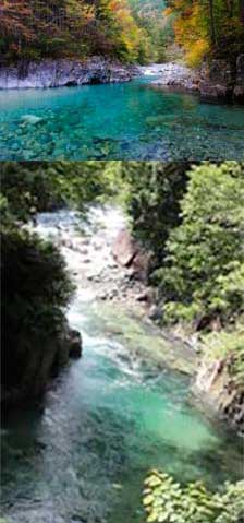 大桑村野尻の阿寺橋を渡った先にある阿寺渓谷。 砂小屋山に源を発する阿寺川が流れる渓谷で、全長約15キロある清流の両岸には木曽五木が育つ。 四季折々に表情を変える渓谷美のなかでも、流れる水の美しさは格別。エメラルドグリーンの清流はここならでは。 川の深みがまるで浅瀬に感じられるほど透明度抜群。