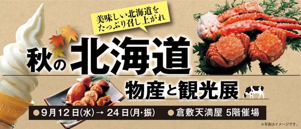 天満屋倉敷店が新店舗移転10周年を迎えたとともに、日本遺産「荒波を越えた男たちの夢が紡いだ異空間~北前船寄港地・船主集落~」に小樽市と倉敷市が追加認定されたことを記念して、9月12日から「秋の北海道物産と観光展」が開催されます。