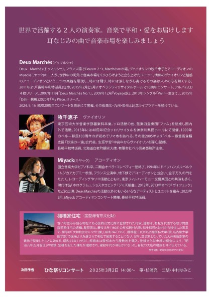 公演内容:世界で活躍する2人の演奏家が音楽で平和・愛をお届けします。