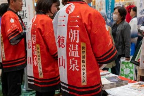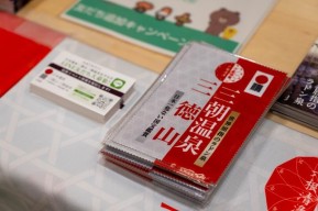 鳥取県三朝町の『六根清浄と六感治癒の地 〜日本一危ない国宝鑑賞と世界屈指のラドン温泉』のブースでは、日本遺産の紹介のほか、三朝温泉を使った化粧水など特産品の販売や、LINE友達登録キャンペーンを実施。