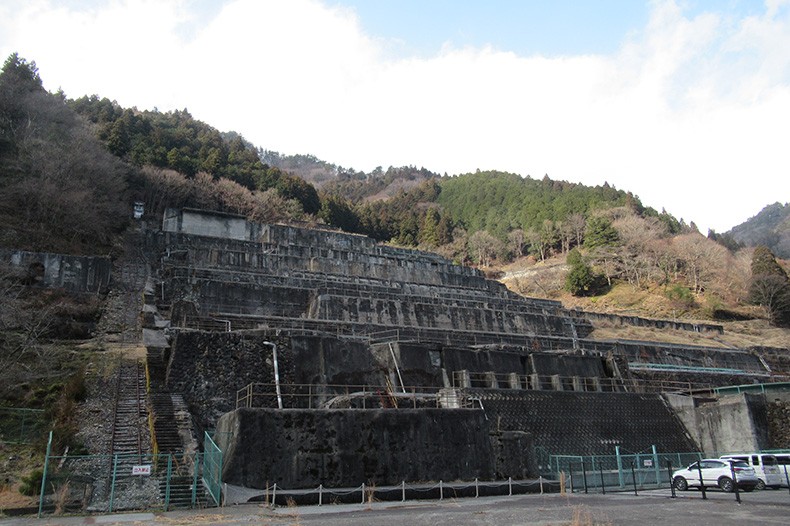 選鉱場が閉鎖された後も建物は残っていたそうですが、平成16(2004)年に老朽化のため取り壊され、現在私たちが見られるのはその基礎部分だけ。それでも、山の斜面に長さ165m・幅110mにわたって連なる巨大なコンクリート遺構は迫力があります。