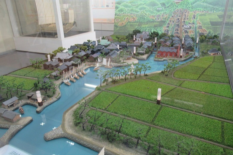 ミュージアムに展示されたジオラマの奥の方、赤レンガ建物がある辺りが、銀の馬車道の始点・飾磨津物揚場です。