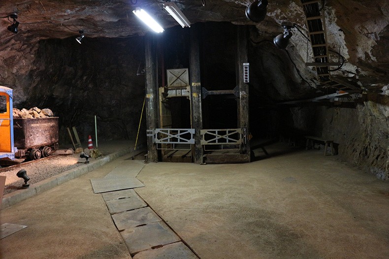 さらに進んで、観光坑道の一番奥までやってきました。深さ730mの「光栄立坑」を降りていく2階建てエレベーターが姿をあらわしました。ここまでは、いわば“通勤路”。立坑をエレベーターで降りた先にある坑道が鉱員たちの仕事場になります。