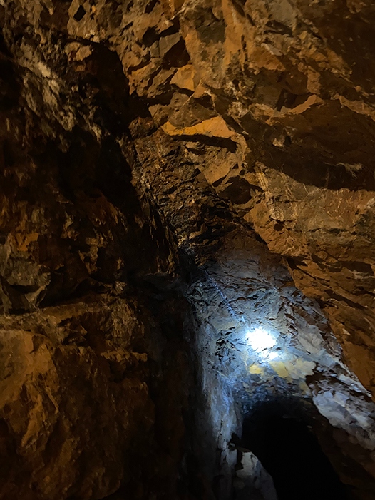 さらに進むと、高さ20mに及ぶ空洞がありました。銅鉱脈を上に向かって掘った跡です。