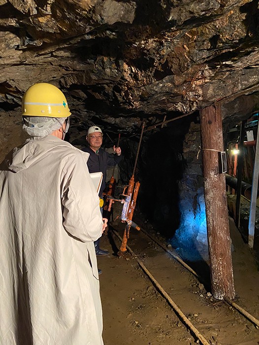 和田さん:地質調査などでは、ボーリングは下向きに行いますが、鉱山では鉱脈を探すために横向きに行います。白みがかった石英が見つかると、そろそろ鉱脈が近いというサインです。