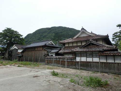 中国山地を背に主屋や新建、数棟の土蔵が建つ。土間の高窓から採光を取り入れるなど、雪深い気候に対応した造りが施されている。