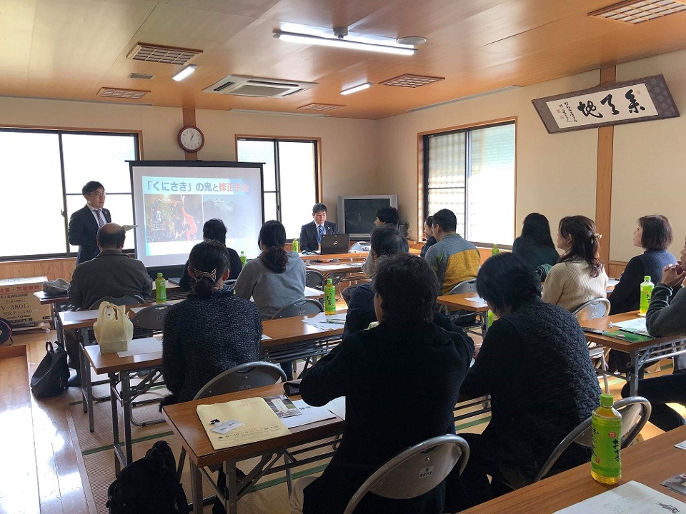 豊の国千年ロマン観光圏主催のガイド研修で、まずは修正鬼会の内容を詳しく学び、英語を訳すときに必要な情報を整理する作業をしました。