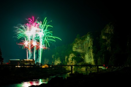 山国川の水面にうつる花火と照らしだされた競秀峰の写真を撮ってみませんか。