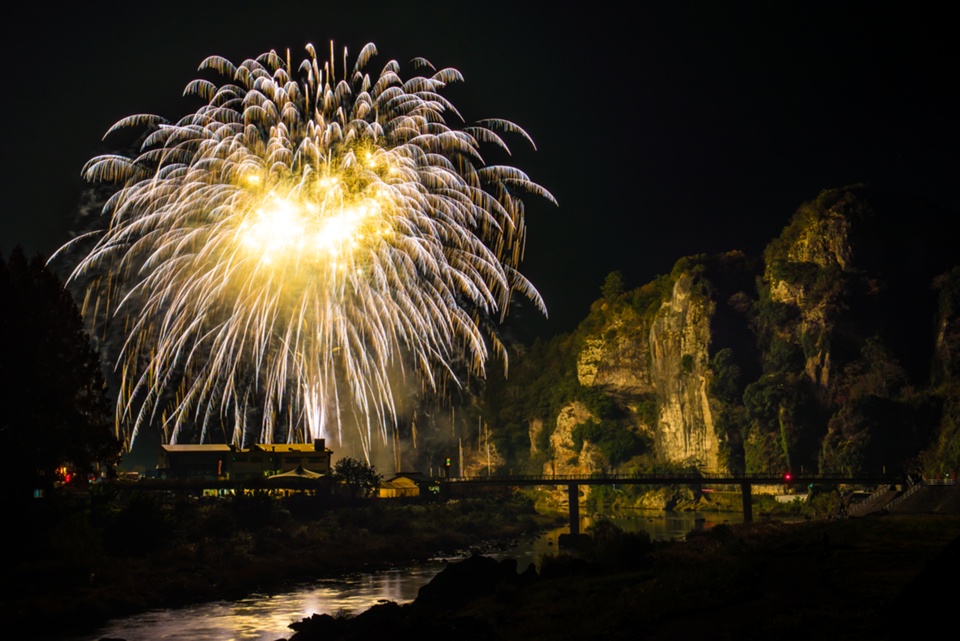 花火は間近でみることができ、花火の大音量は岩にあたって二重三重に響く「日本一の音の花火」です。