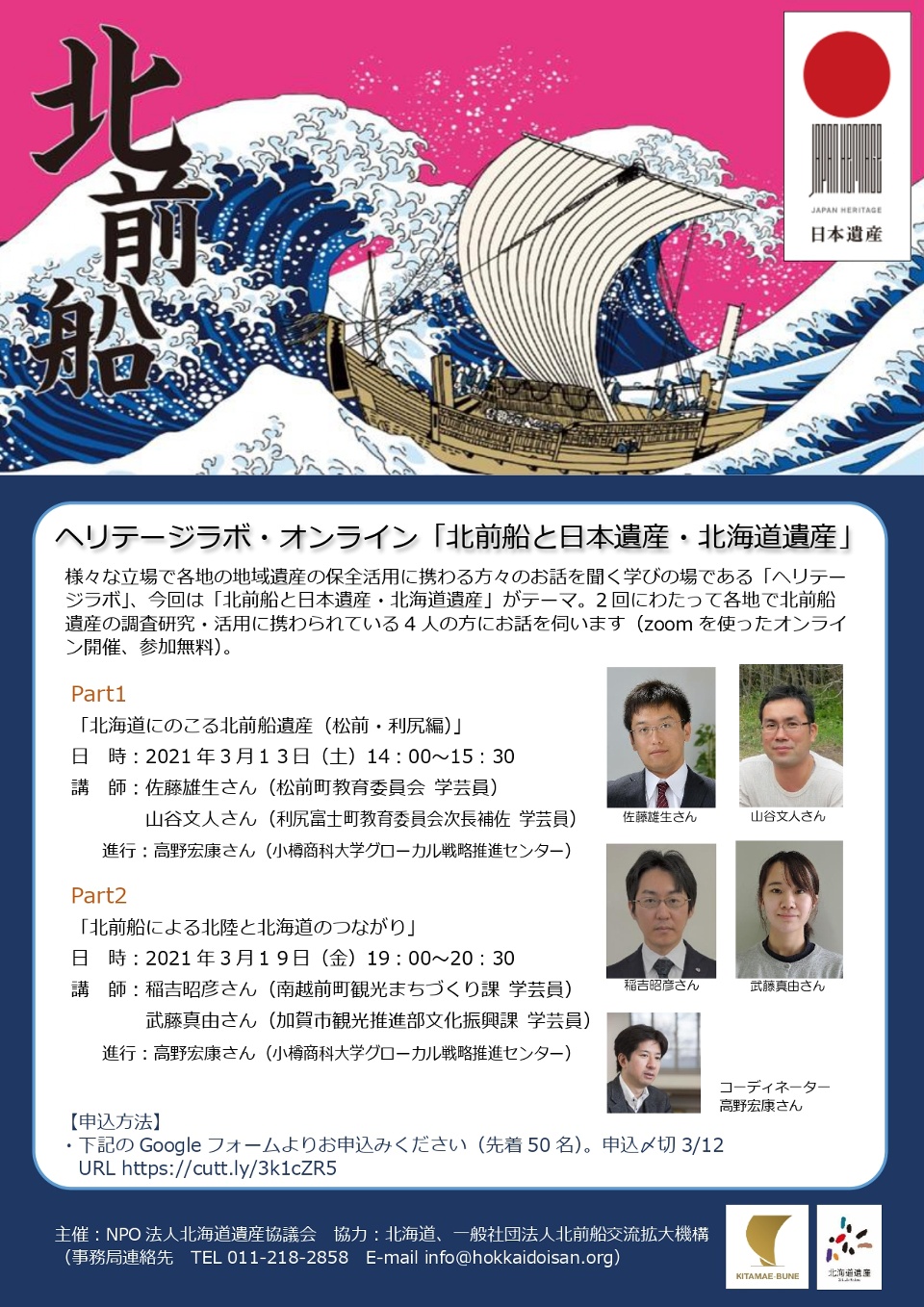 地域遺産の保全活用に携わる方々のお話を伺う「ヘリテージラボ」では、今回、「北前船と日本遺産・北海道遺産」とテーマに「松前・利尻編」、「北陸と北海道のつながり編」の2回、オンラインセミナーを開催します。