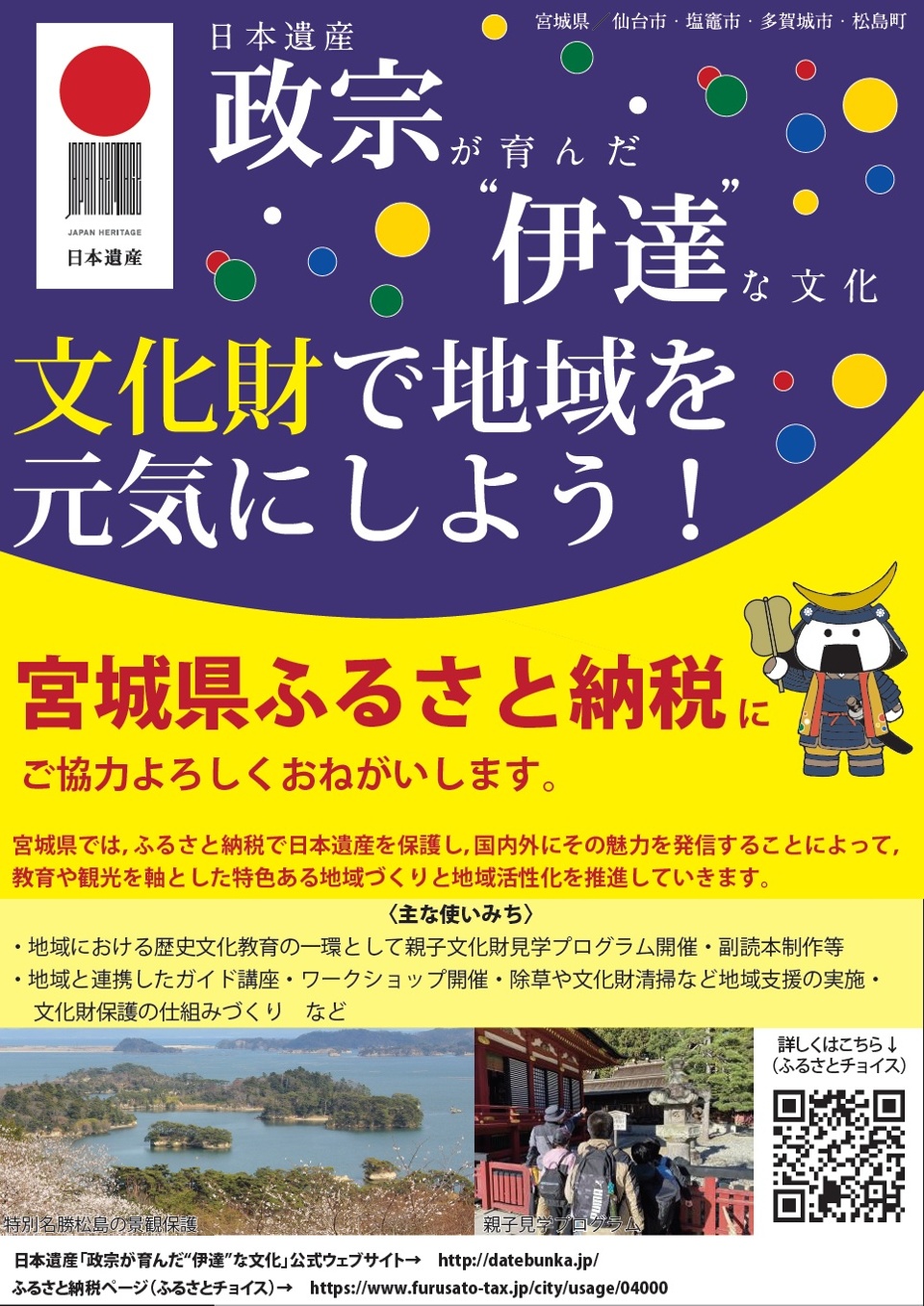 下記URLのふるさと納税ページ(ふるさとチョイス)から宮城県への支援を選び、主な使いみちで「日本遺産「政宗が育んだ“伊達”な文化」文化財で地域を元気にしよう!」を選択して下さい。