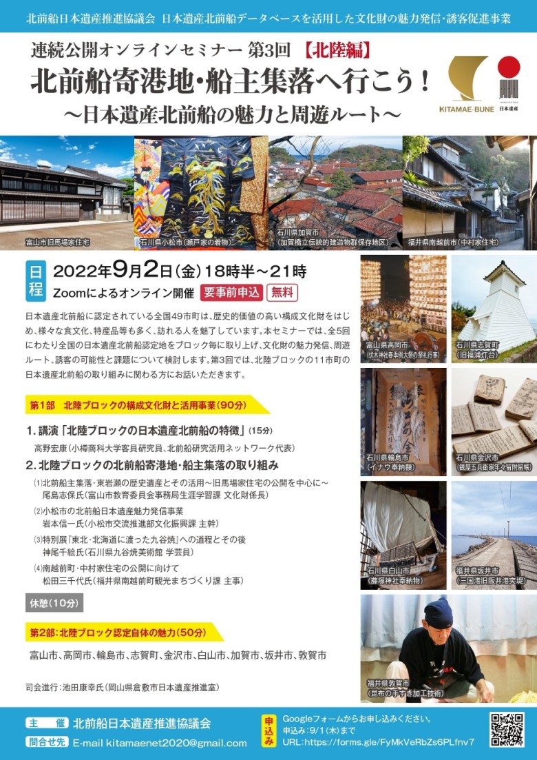 連続公開オンラインセミナー 第3回【北陸編】 北前船寄港地・船主集落へ行こう!〜日本遺産北前船の魅力と周遊ルート〜 ご案内