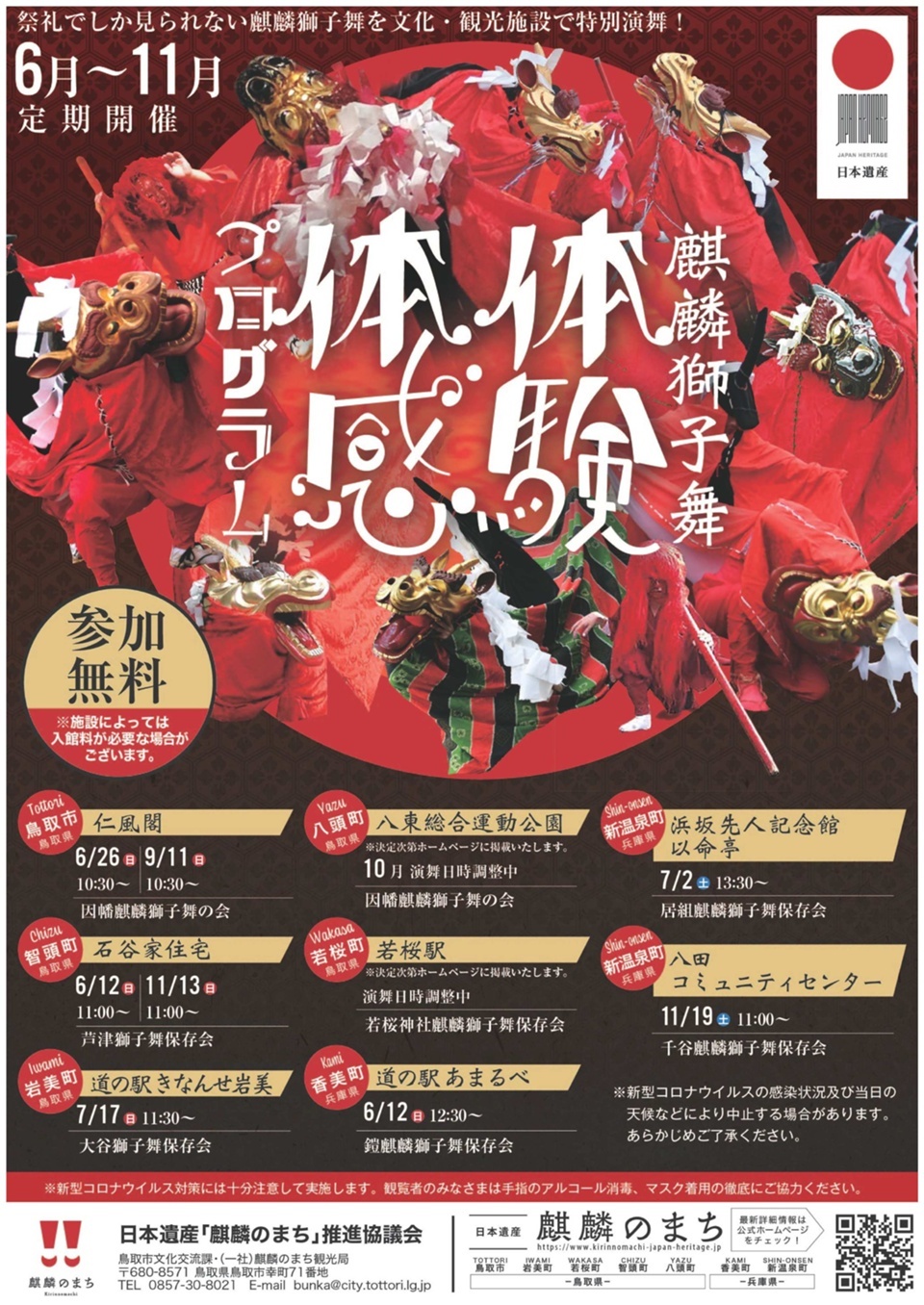 令和元年5月の日本遺産認定以降、日本遺産「麒麟のまち」推進協議会を中心として、情報発信や普及啓発の取組を推進しています。この一環として、通常は祭礼でしか見ることのできない麒麟獅子舞をより多くの方々に体感していただけるよう、圏域内の観光スポットなどで麒麟獅子舞の演舞を行います。