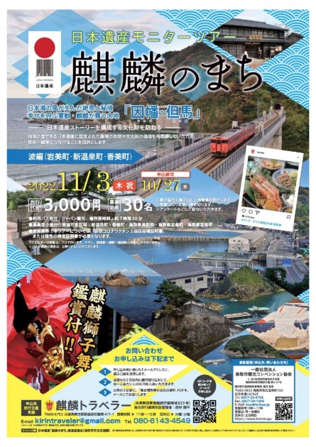 日本遺産に認定されたストーリー「日本海の風が生んだ絶景と秘境 幸せを呼ぶ霊獣・麒麟が舞う大地「因幡・但馬」」の認定地域である、麒麟のまち(鳥取市・岩美町・若桜町・智頭町・八頭町・香美町・新温泉町)を巡るモニターツアーを実施します。