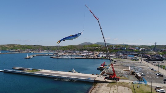 北海道江差町が日本遺産認定を記念して制作した「最大のニシンのぼり」が、2018年5月に3度、町内のかもめ島近くでクレーンにより大空を遊泳しました。