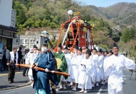 4月23日(日)には、町指定無形民俗文化財「三徳山御幸行列」が5年ぶりに三朝温泉街にて実施されます。午前10時に三徳山三佛寺本堂にて神事が行われた後、13時30分頃には三朝温泉街を総勢約200名の武士や僧侶が御神輿と共に厳かに練り歩きます。