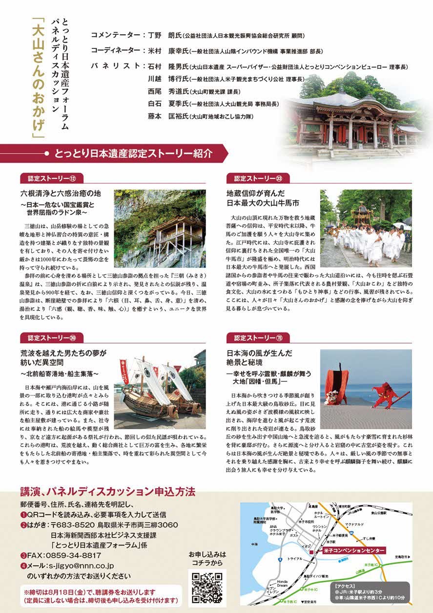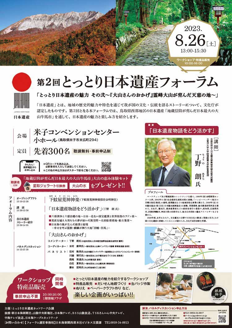 鳥取県内で認定されている日本遺産(「とっとり日本遺産」)が集まります。鳥取県西部の日本遺産「地蔵信仰が育んだ日本最大の大山牛馬市」のストーリーを軸に県内日本遺産の楽しみ方を紹介します。オープニングアクトには下蚊屋荒神神楽、講演には丁野朗さんをお迎えします。またワークショップや特産品販売も行い、広く日本遺産の魅力を発信します。