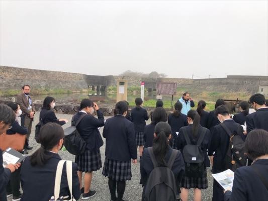 今回の視察研修では、事前の調べ学習で調査した菊池川流域の歴史や史跡等について知識を深め、地域の魅力を知るということを目的に、ガイドからの説明を熱心に聞かれていました。