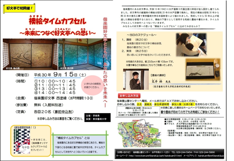 偕楽園内にある好文亭は、天保13 年(1842)に水戸藩第9 代藩主徳川斉昭が自ら設計し建てられました。好文亭内の創建時の襖絵は昭和20 年の水戸空襲で焼失し、現在の襖絵は昭和30 年から同33 年の復元工事で東京藝術大学日本画教官により描かれました。完成してから50 年以上が経過した襖絵を修理するにあたり、襖絵の下張りとして使用する和紙に墨絵や書をかき、タイムカプセルとして次世代へとつないでいきます。