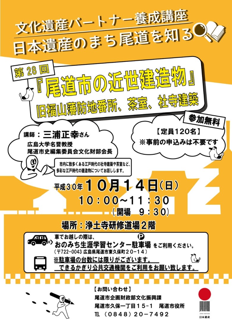 このたび、下記日程で、第28回文化遺産パートナー養成講座を開催します。今回は、尾道市内にある江戸時代の建造物について、広島大学名誉教授 三浦正幸先生にご講演いただきます。特に、旧福山藩防地番所、茶室、寺社建築などの魅力について、分かりやすくお話しいただきます。ぜひご来場ください。
