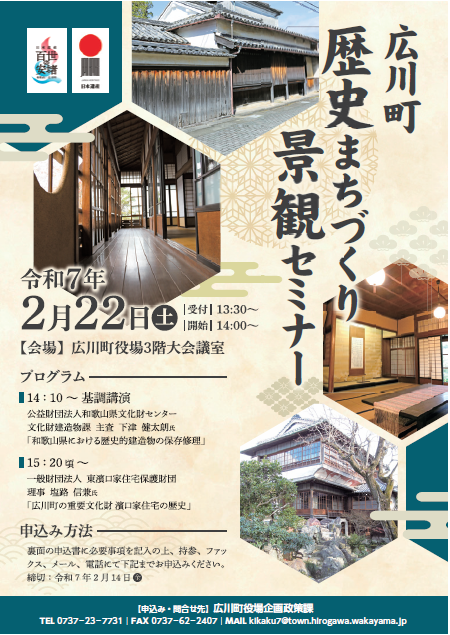 広川町では、歴史的建造物や古い町並みを活用したまちづくりを推進しています。歴史的資源、景観を守りながらより一層の地域活性化を促進する取組として歴史まちづくり・景観セミナーを開催します。歴史まちづくり、景観保全にご興味のある方は是非ご参加下さい。