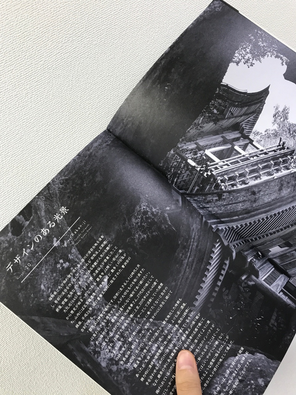 「デザインのある光景」のタイトルで掲載された記事とモノクロの写真からは、岩窟の寺院「羅漢寺」の荘厳さと神秘性が伝わってきます。