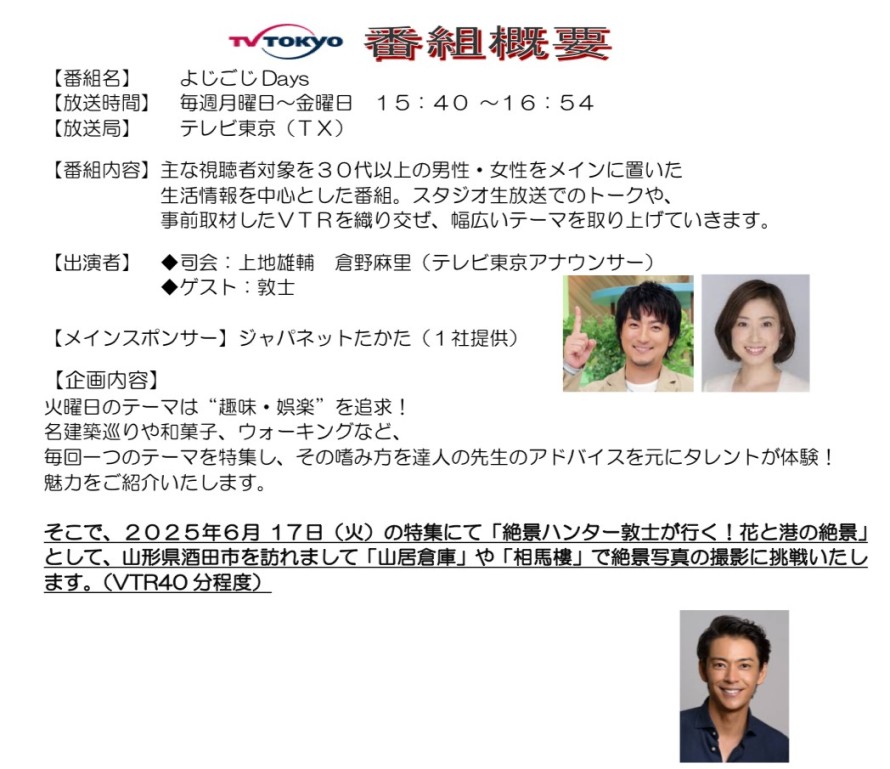 【酒田市】テレビ東京「よじごじDays」で「北前船寄港地の酒田」をご紹介