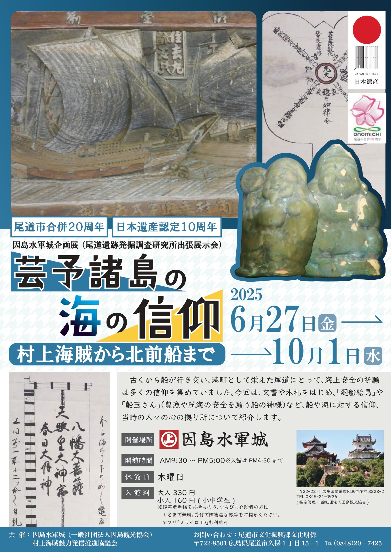 古くから船が行き交い、港町として栄えた尾道にとって、海上安全の祈願は多くの信仰を集めていました。今回は、文書や木札をはじめ、「廻船絵馬」や「船玉さん」(豊漁や航海の安全を願う船の神様)など、船や海に対する信仰、当時の人々の心の拠り所について紹介します。