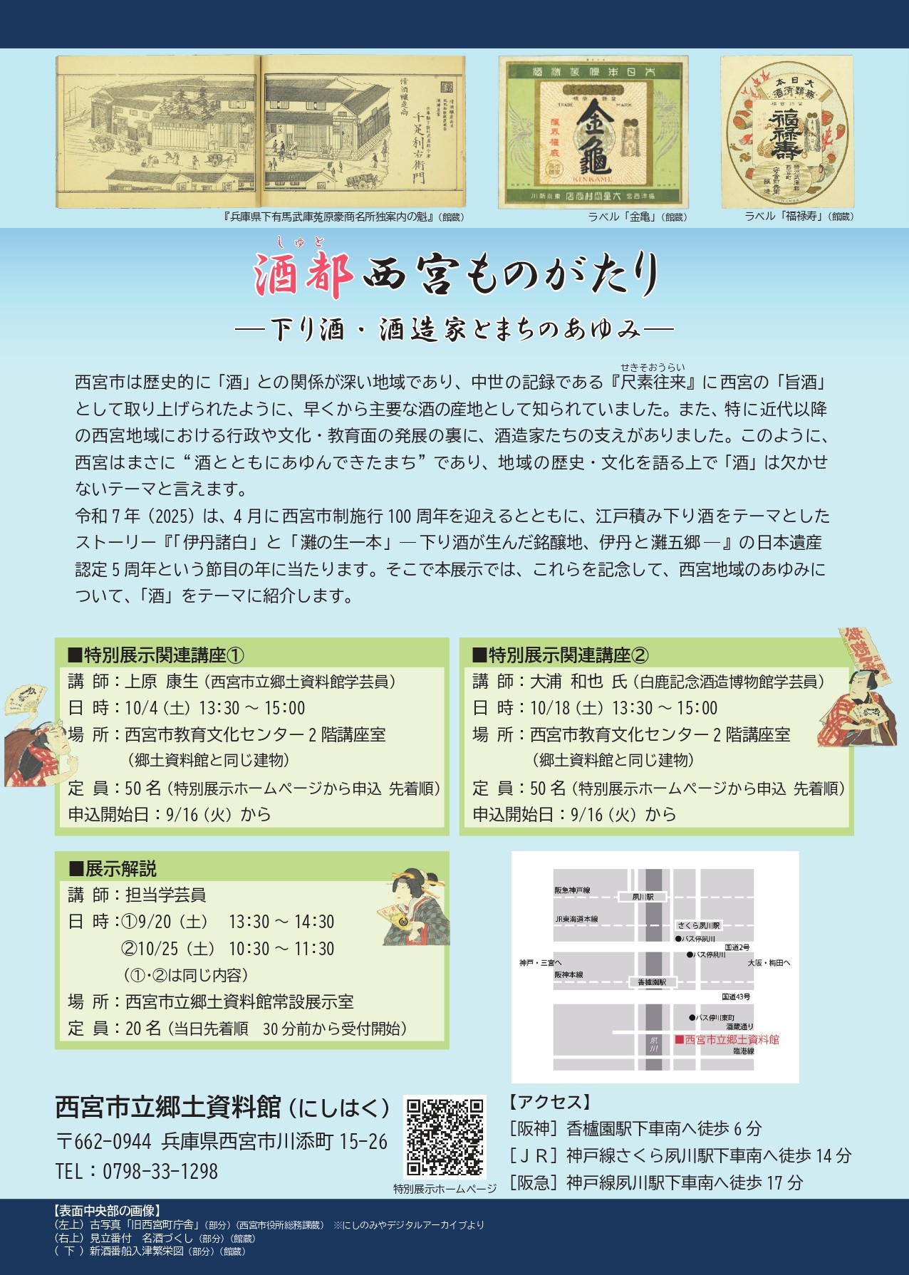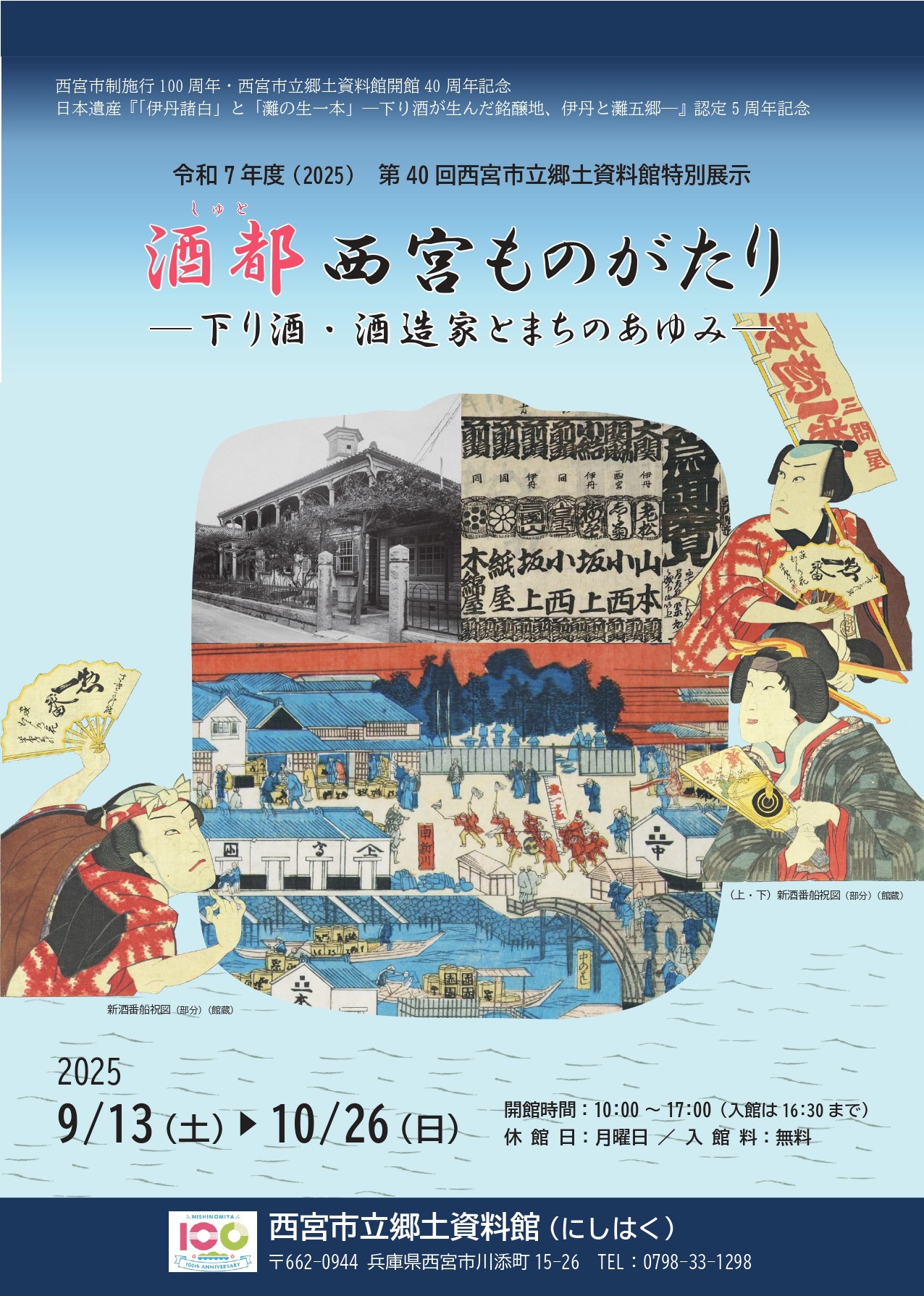 令和7年(2025)は、4月に西宮市制施行100周年を迎えるとともに、江戸積み下り酒をテーマとしたストーリー『「伊丹諸白」と「灘の生一本」―下り酒が生んだ銘醸地、伊丹と灘五郷―』の日本遺産認定5周年という節目の年に当たります。そこで本展示では、これらを記念して、西宮地域のあゆみについて、「酒」をテーマに紹介します。