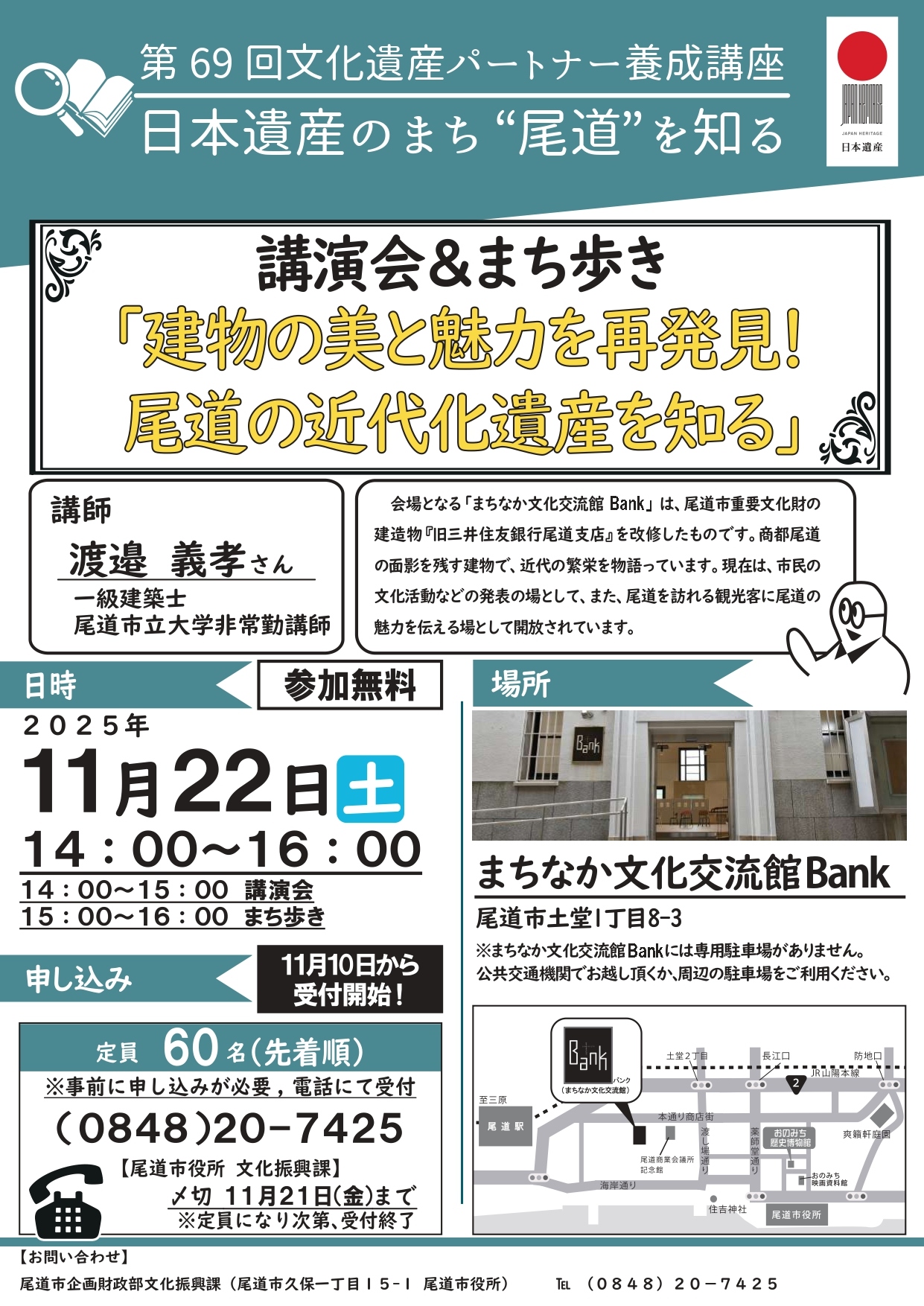 講師に渡邉義孝さん(一級建築士・尾道市立大学非常勤講師)をお招きし、講演会とまち歩きを開催します。