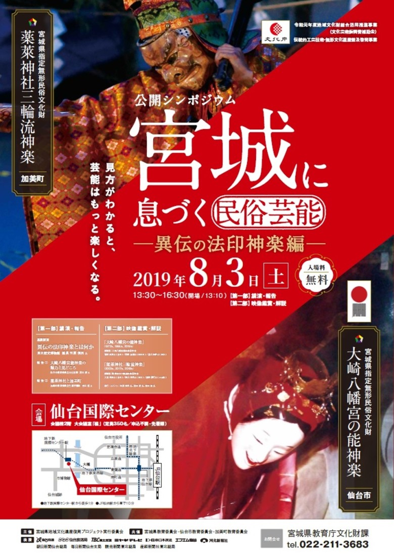 この公開シンポジウムは、県内神楽の歴史を考える上で重要な位置を占める「異伝の法印神楽」をテーマとしています。専門家による講演と報告に加え、県指定無形民俗文化財(日本遺産)「大崎八幡宮の能神楽」と、同じく県指定無形民俗文化財「薬莱神社三輪流神楽」の保存会の皆様にご登壇いただき、芸能の担い手自身による解説を通じて、民俗芸能鑑賞のポイントを学びます。芸能の奥深さにふれる午後にひとときをお楽しみ下さい。