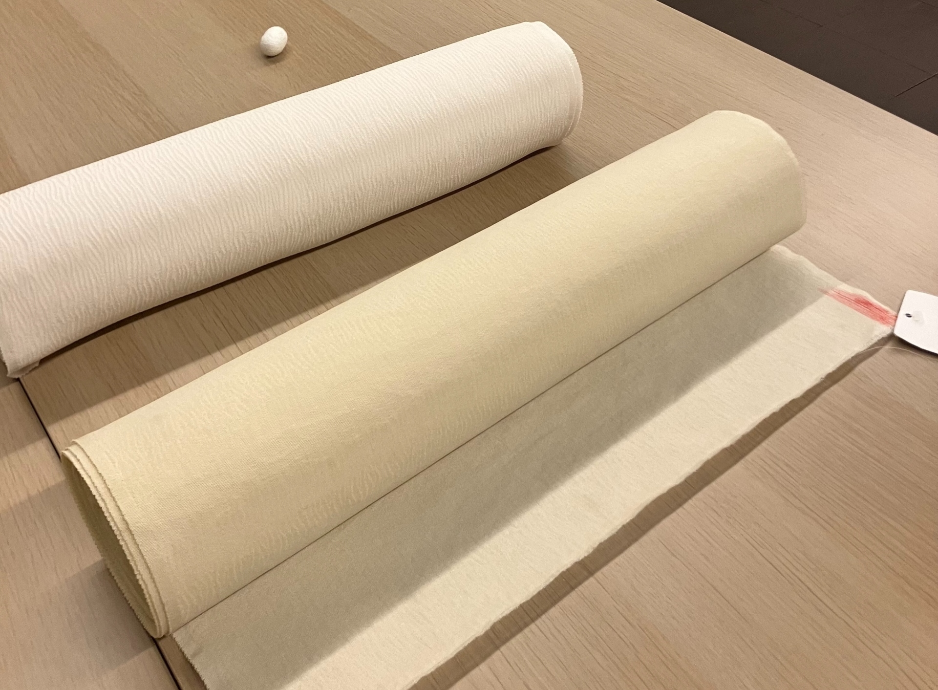たしかに触らせていただいた反物は柔らかく、細かなシボが肌に優しく感じます。丹後ちりめんがパリコレで、某ブランドのオートクチュールに使われたという話も納得です。では隣にある反物は?