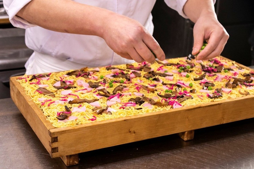 また食文化も、ちりめん産業に根ざしています。有名なのは丹後ばら寿司。祭りの日やハレの日に振る舞われる家庭の味です。ポイントは、サバのそぼろを入れること。また松ぶたという、餅を入れる細長く浅い箱で作ることで、一度で多くの人に振る舞うことができるというのも、ちりめんの生産で繁栄する地域柄を感じます。