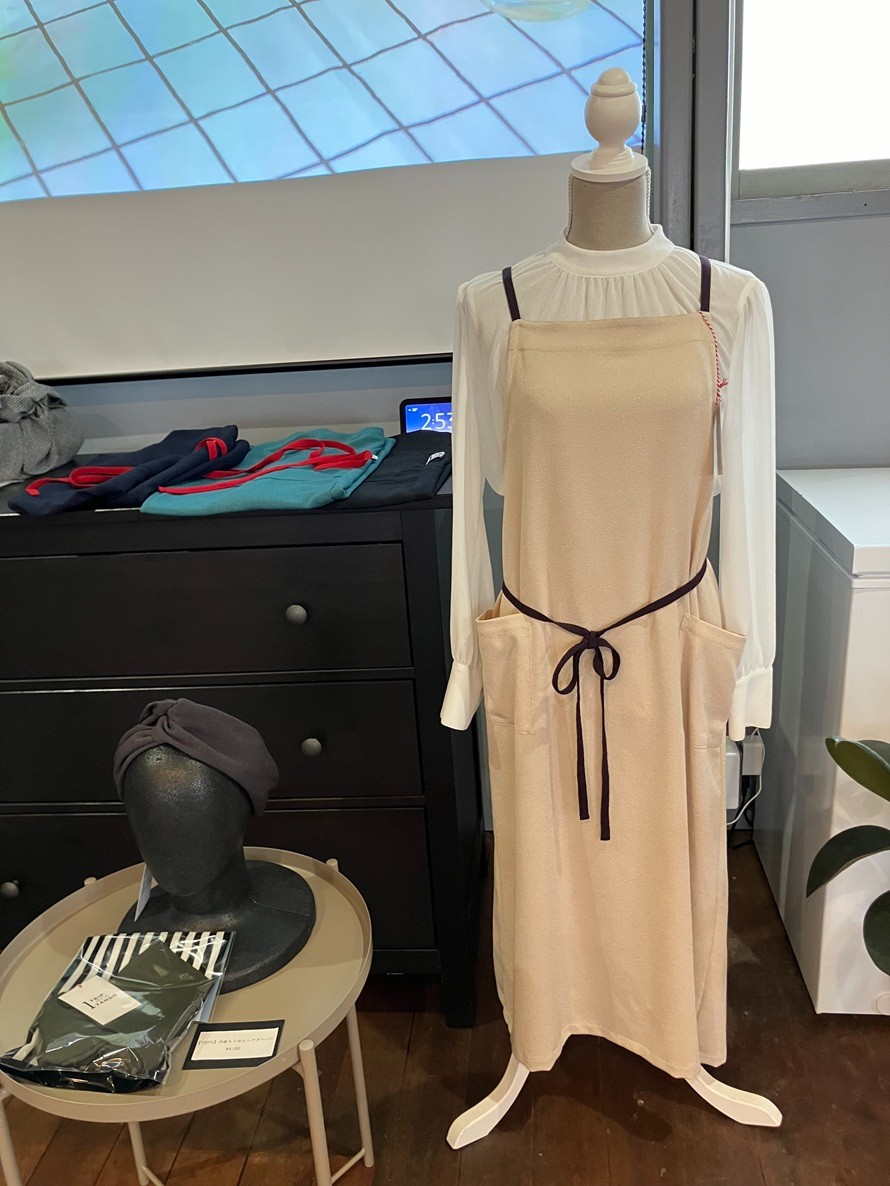 自社ブランドを立ち上げたことで、レンタルスペース内に自社のファクトリーショップをオープンさせ、カフェを楽しみながら、「丹後ちりめん×アパレル」の可能性を知ってもらうスペースを設けたそう。実際にジャケットやワンピースを拝見しましたが、丹後ちりめんの特長である、シワになりにくい点や肌触りの良さを普段着にできる心地よさを感じました。ちなみにすべてセミオーダーで作っていただけるのが、メーカーとして縫製工場とのつながりが密な同社だからこそのポイントです。