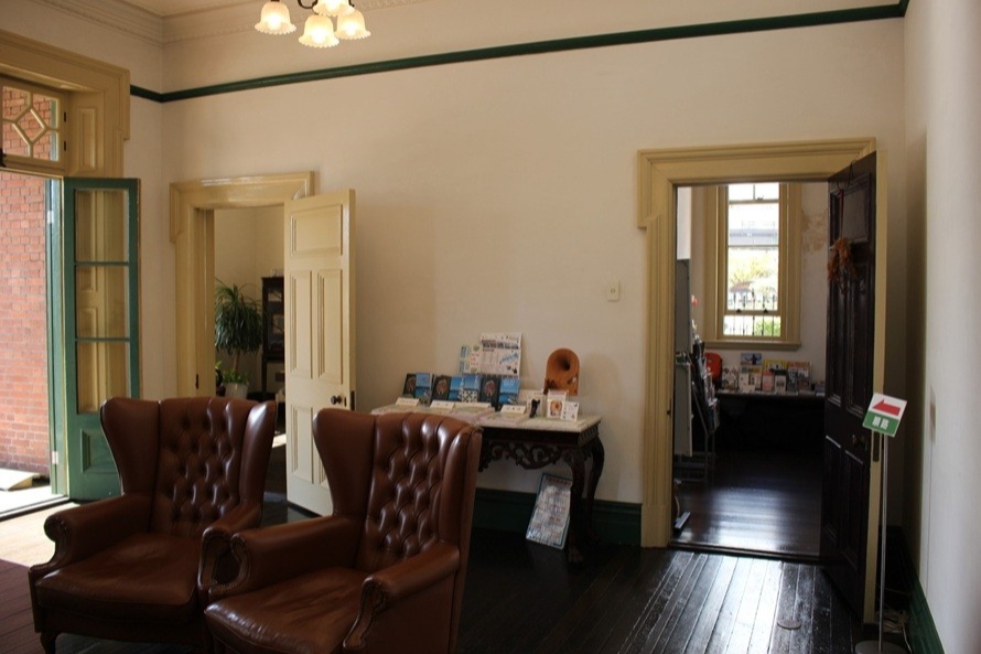 徳増さん:設計者は英国工務局上海事務所技師長のウィリアム・コーワンという人物ですが、施工したのは日本の職人であったとみられ、洋館には通常使われない瓦屋根が採用されているなどユニークな特徴を残しています。当館ならではの設計の特徴として、コンパクトな建物ながら高い機能性を備えていることが挙げられます。1階には廊下がなく、玄関を入ってすぐのロビーから、4つの部屋すべてを行き来できるようになっています。日当たりが良い南側の部屋はお客様の待合室と領事の執務室、北側の部屋は文書室と海事監督官の執務室として使われ、2階は海事監督官の住居となっていました。現在は埋め立てられて道ができていますが、当時は領事館の目の前まで海が広がっており、その絶景を楽しめるように、1階・2階の南側にはベランダが設置されています。