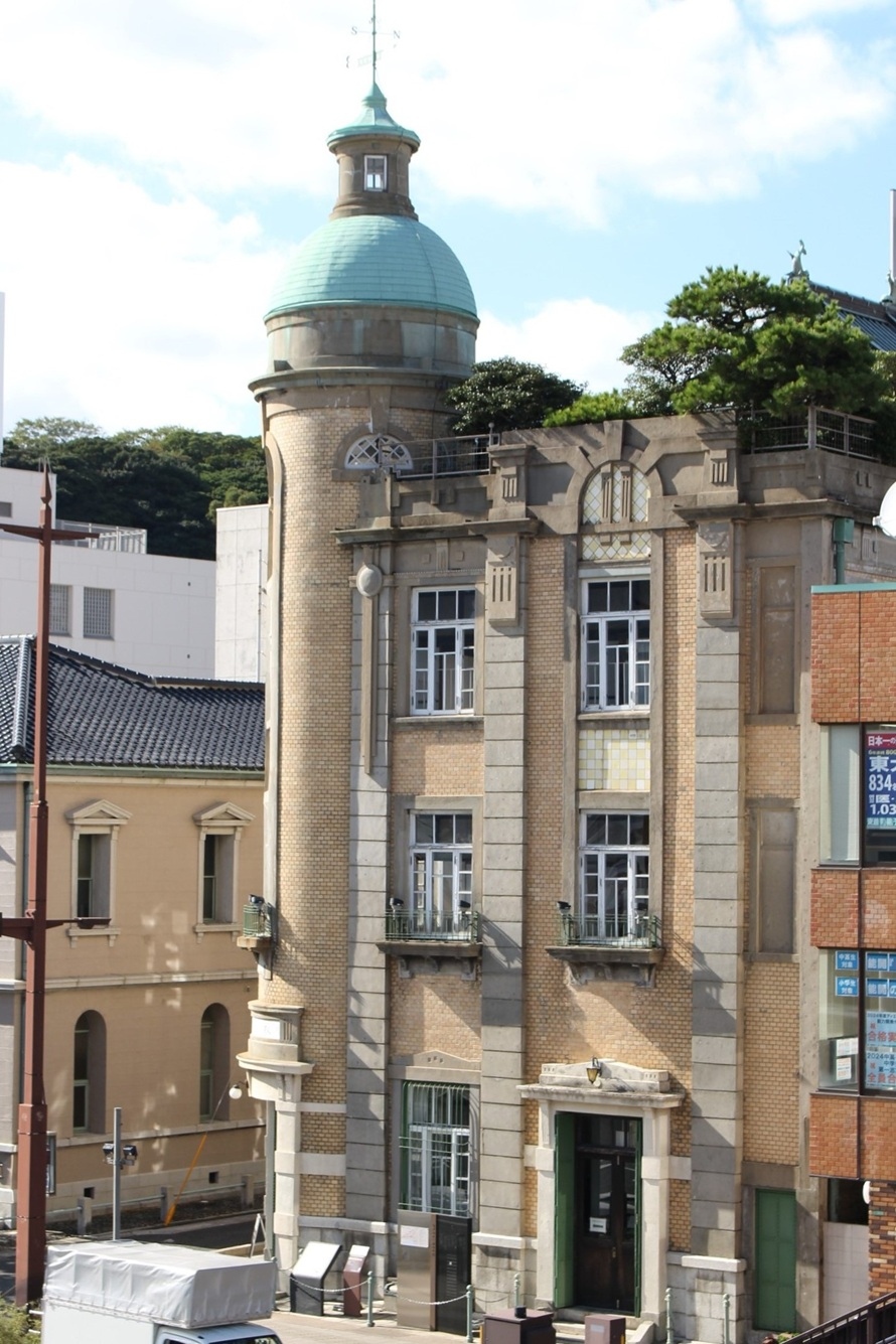 最初に訪れたのは「旧秋田商会ビル」。秋田商会は、創業者・秋田寅之介氏が事業を興し、一代で大きく繁栄した総合商社でした。この建物はその絶頂期であった1915年(大正4年)に建てられた社屋兼住居です。向かいには旧下関英国領事館、隣には下関南部町郵便局、目の前には海が広がる利便性の高い立地です。