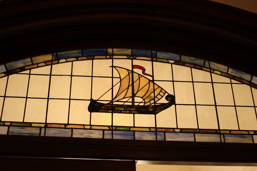 峰さん:元々は山手に建てられた迎賓館であったことから、都市中心部の建物とは趣が異なる山小屋風のデザインが特徴です。入り口の扉上部にはめ込まれたステンドグラスには、海の貿易により富を得た三井物産を象徴するような帆船のイラストが描かれています。