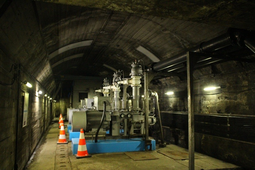 排水ポンプが下関・門司それぞれの立坑に3台ずつ設置されています。1台が常時運転し、残りの2台は予備機です。これらのポンプを使って、水槽に溜まった水を地上にくみ上げています。