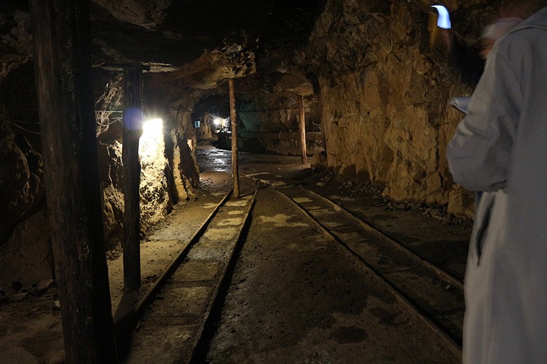 坑道内の温度は年間通してほぼ一定の約13℃。入口から進むにつれて温度の変化が感じられます。冬はほんのりと暖かさを感じますが、真夏には外気温との差が20℃にもなり、長袖が必需品です。入口から水平に延びる坑道は採掘の跡ではなく、採掘場まで鉱員を運ぶトロッコのレールが敷設された“通勤鉄道”でした。現在はレールが撤去され、歩きやすくなっています。