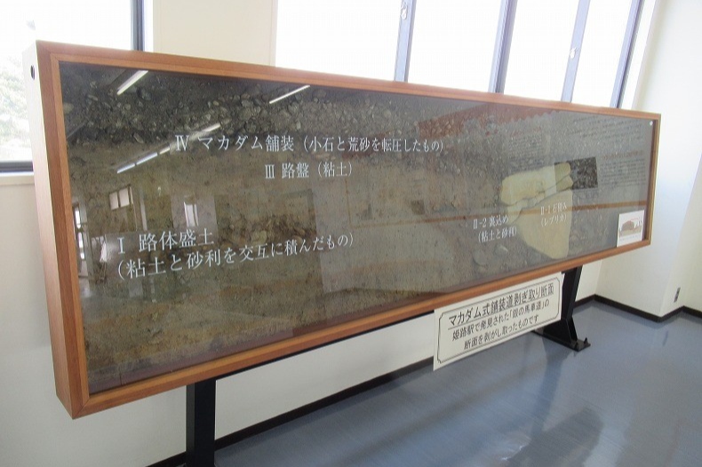姫路みなとミュージアムには、銀の馬車道の剥ぎ取り断面が展示されています。現在私たちが知っているアスファルト舗装とは異なる「マカダム式舗装」の構造を見学できます。