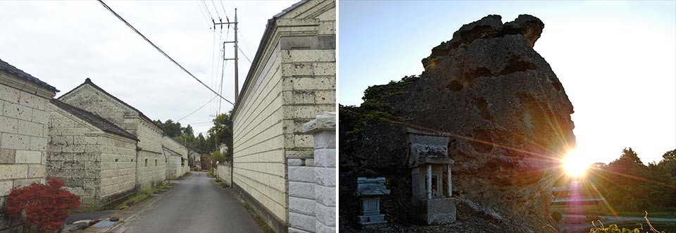 左:大谷石建造物の街並み(芦沼集落)/右:大谷石造の祠(岩原神社)