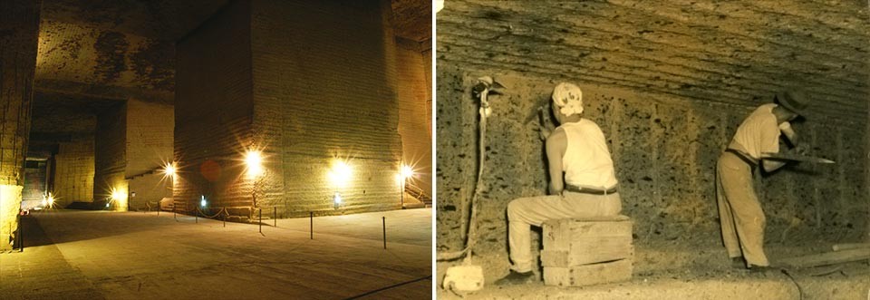 冷気が張り詰める坑内には、天井を支えるために残した柱が立ち並び、行く先々を照らす明かりが重層的な影を生み、神秘的な情景を醸し出す。巨大な柱の先を曲がると、再び柱が立ち並ぶ光景が目前に広がり、次第に方向感覚が失われていく。ここは、採掘産業を支えた石工たちが、手作業で掘りだした巨大な地下迷宮なのである。