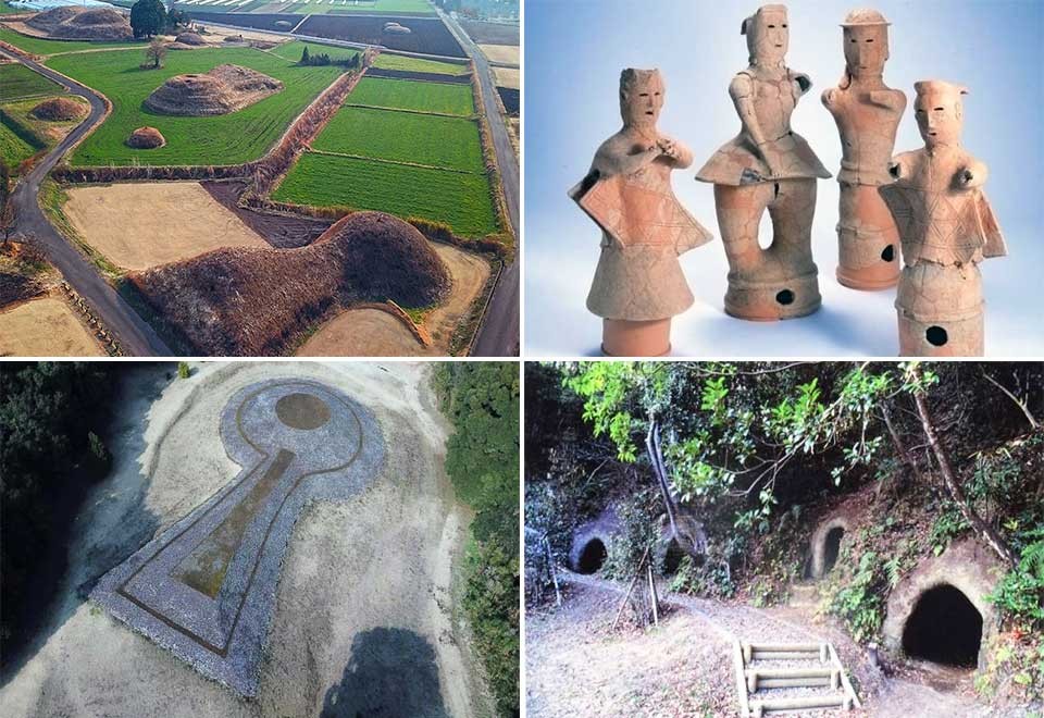左上:田園風景の中の新田原古墳群/右上:ユーモラスな埴輪たち(新田原古墳群)/左下:白亜に輝く古墳(生目古墳群)/右下:自然と一体化した横穴墓群(蓮ヶ池横穴群)