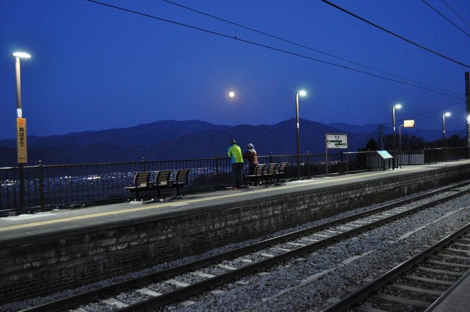 標高547mに位置するJR姨捨駅のプラットホームからは、千曲川対岸の山並みから昇る月を眼の高さに望むことができ、絶好の月見の場所であり、まさに「月の駅」といえよう。急傾斜地に設けられた駅なので、今では珍しいスイッチバック方式でプラットホームに入る。列車の車窓からは、長野盆地を見下ろす大パノラマを眺望することができ、日本鉄道三大車窓の一つである。