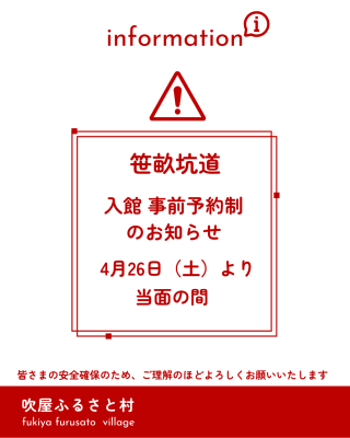 構成文化財「笹畝坑道」の入口改修工事に伴い、当面の間、入館を事前予約制とさせていただきます。 (受付先:0866-29-2811 高梁市観光協会吹屋支部 3日前まで受付)
